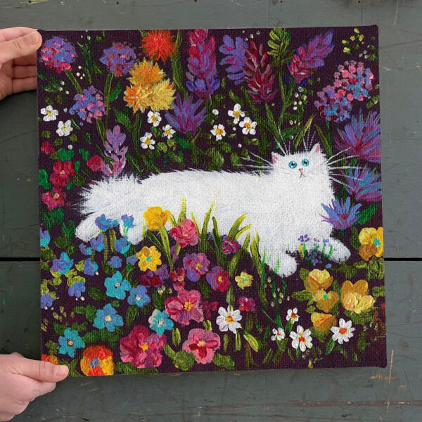 Cat Square Canvas – White Cat In Flowers – Canvas Print – Cat Canvas – Cats Canvas Print – Cat Wall Art Canvas – Furlidays