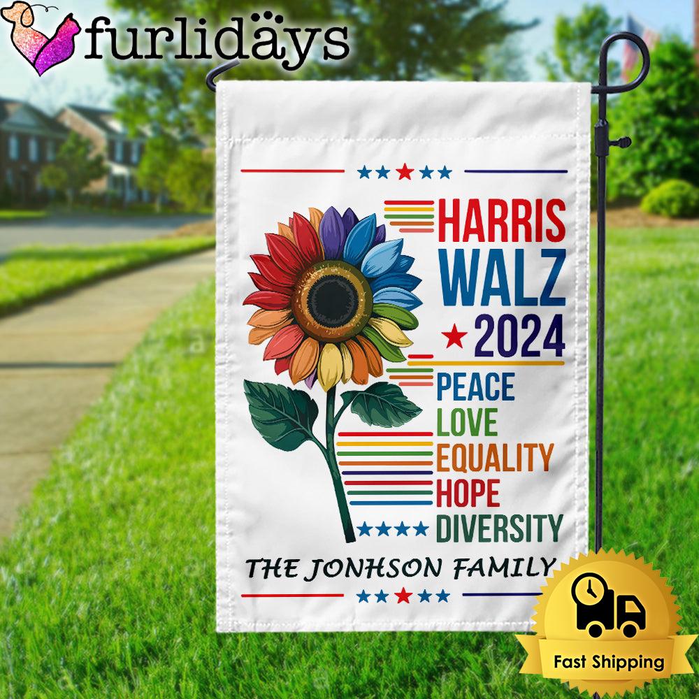 Product details: Custom Family Name Harris Walz 2024 Peace Love Equality Hope Diversity Garden Flag
