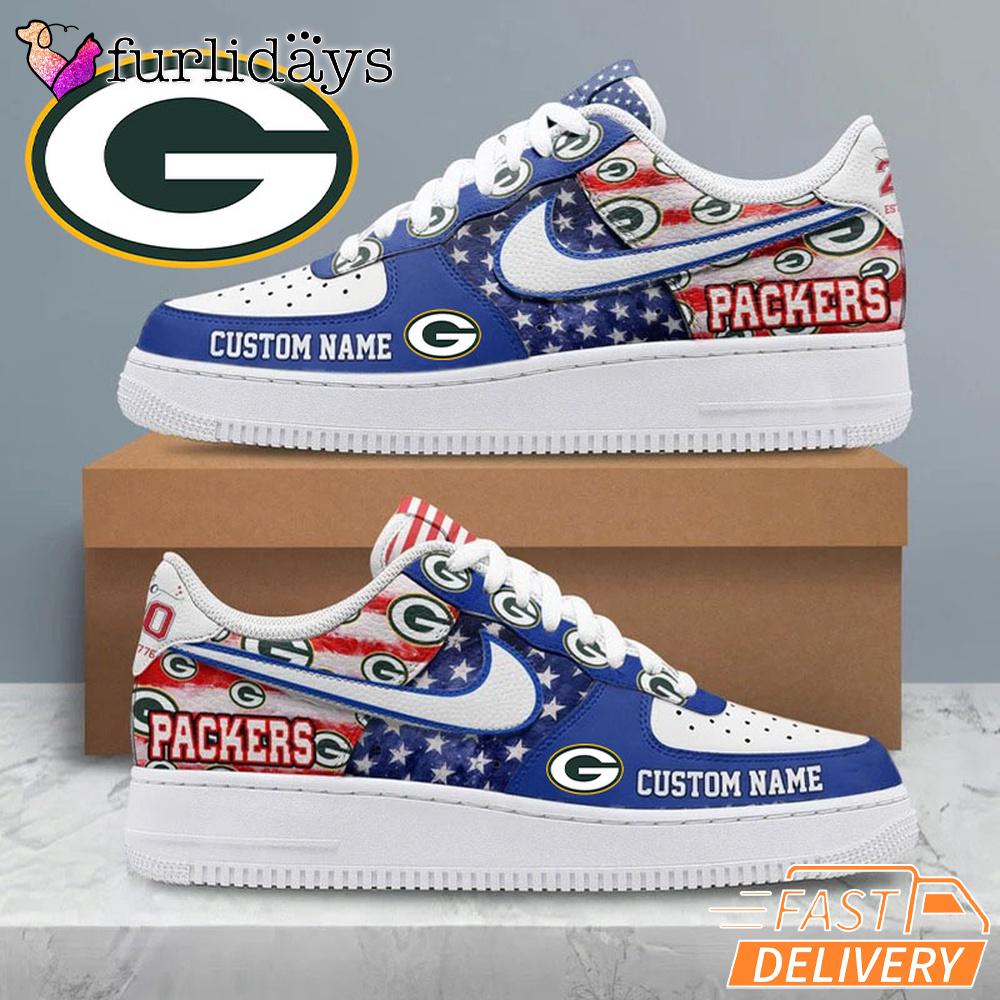 Green Bay Packers USA Flag Custom Air Force 1 Sneakers 250 Years Shoes Step up your game-day style with these Green Bay Packers USA Flag Custom Name AF1 Style Sneakers, designed for true fans who want to stand out. Featuring a bold American flag design blended with iconic Green Bay Packers colors and logo, these sneakers celebrate both team pride and the spirit of the 250th Anniversary of the United States.