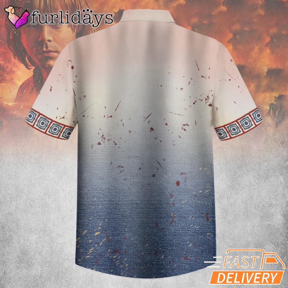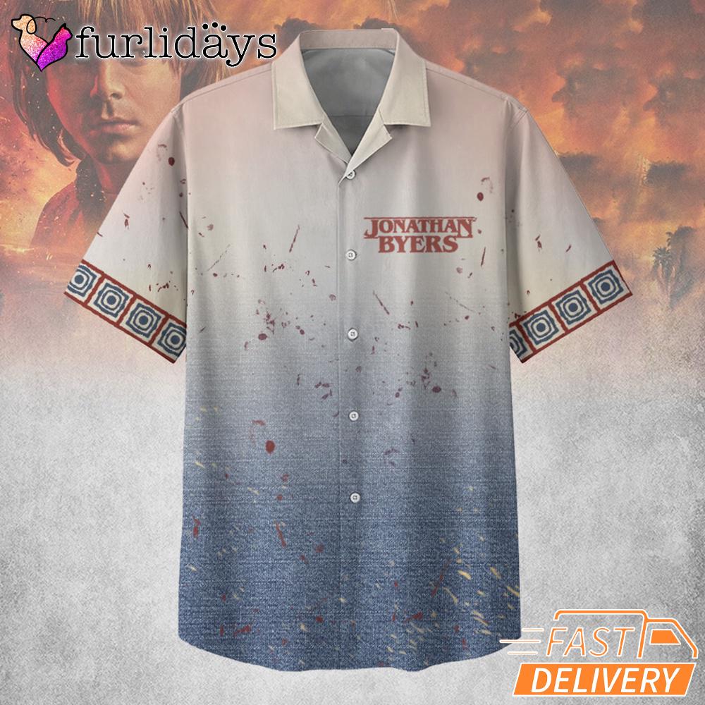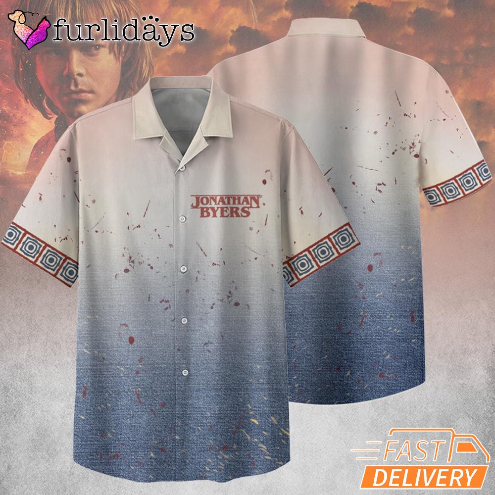 Photos Of Jonathan Byers S5 Soft Gradient Hawaiian Shirt, Light Wash Stranger Things 5 Merch