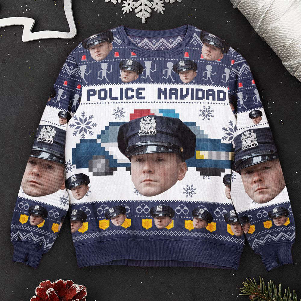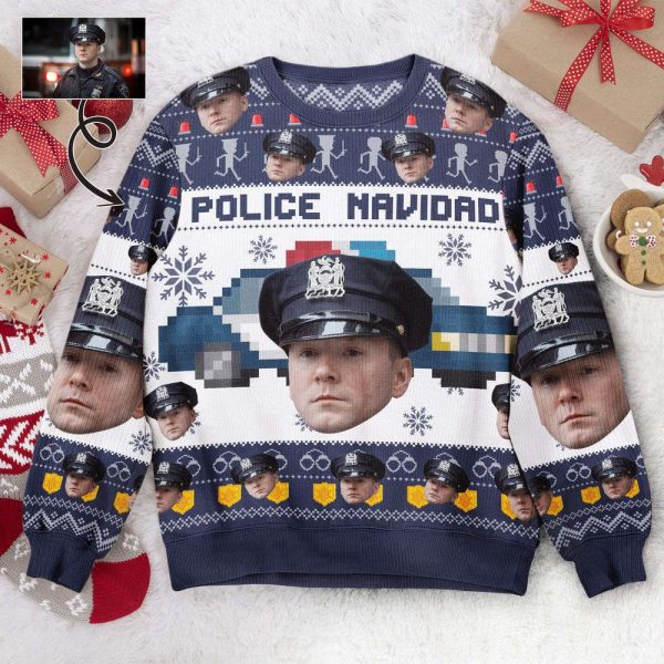 Join us in honoring the brave men and women who protect and serve by donning the Police Navidad Personalized Photo Ugly Sweater this holiday season. Order yours now and make a statement while spreading holiday cheer!