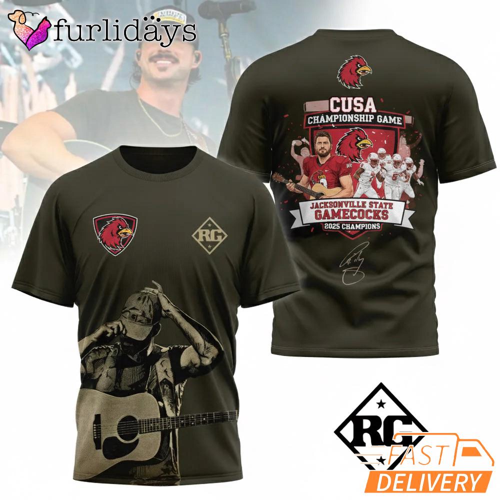 Riley Green Jax State CUSA Champs 2025 3D T-Shirt Discover the ultimate all-over print shirt designed for fans of every niche. Whether you love sports teams, music bands, movies, anime, or gaming, this shirt lets you showcase your passion in bold, vibrant detail.