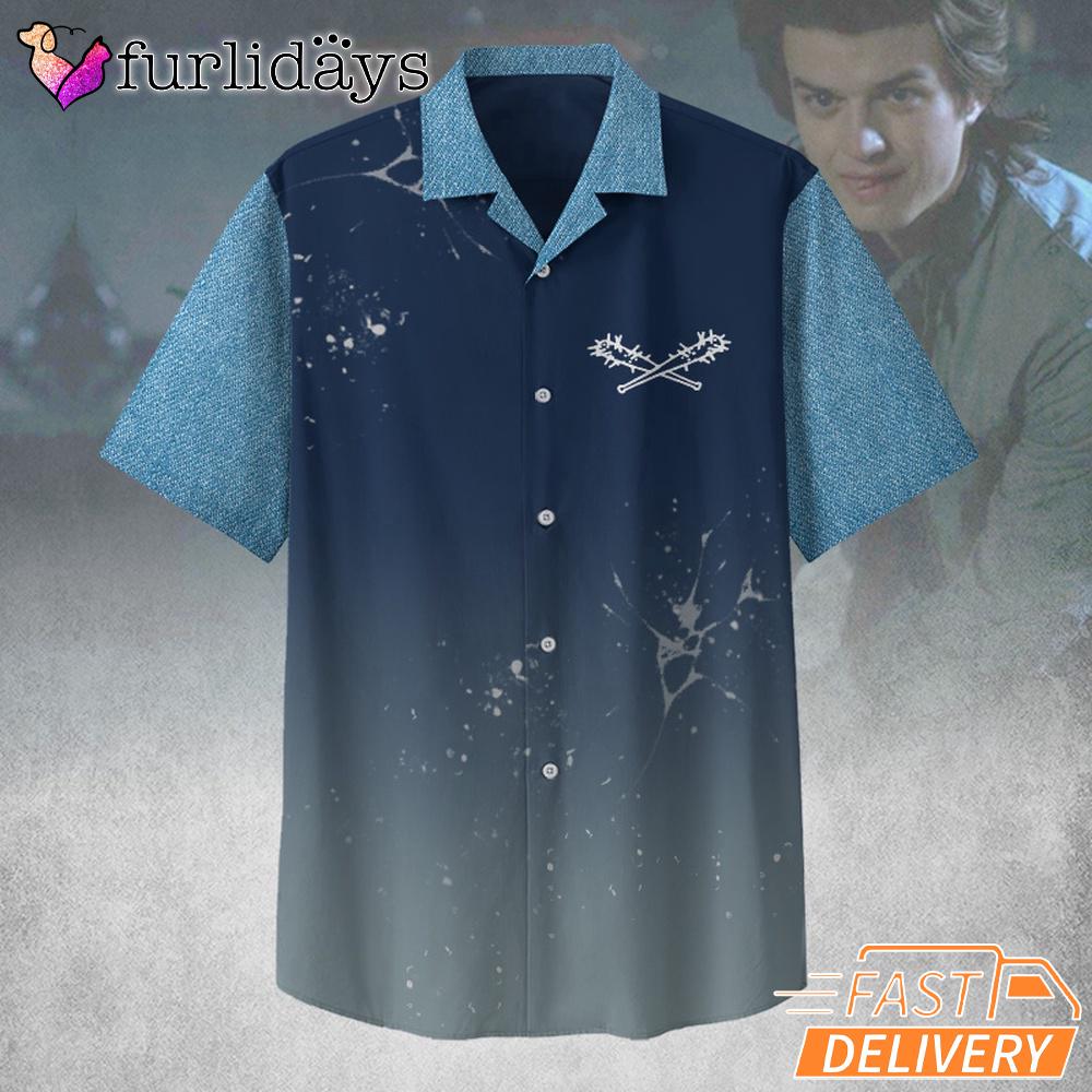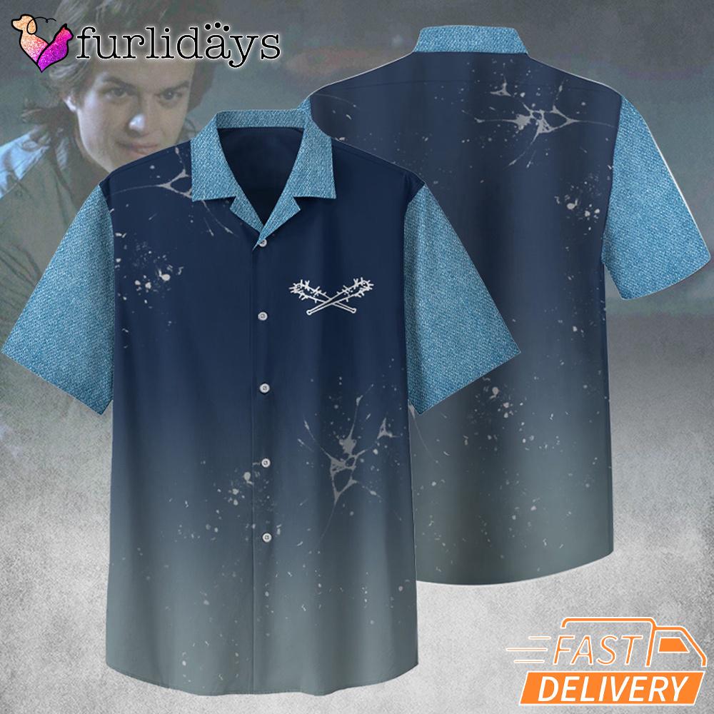 Photos Of Steve Harrington S5 Stardust Hawaiian Shirt, Dark Blue Upside Down Aloha Tee